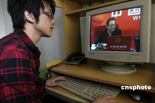 2009年2月28日,一位網(wǎng)民觀看***總理與網(wǎng)友在線交流,接受中國**網(wǎng)、新華網(wǎng)專訪??偫砩暇W(wǎng)交流受到網(wǎng)民極大關(guān)注。 中新社發(fā) 魯谷 攝