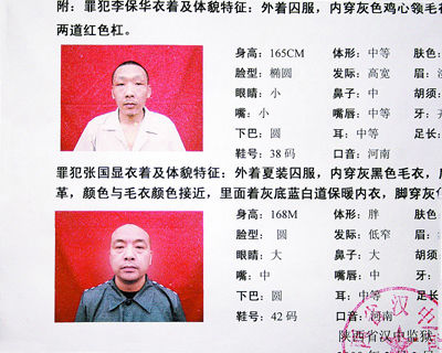 據(jù)陜西省漢中監(jiān)獄通緝資料顯示,兩名越獄的罪犯其中一人名叫李保華,又名李寶華、李寶,1972年2月2日生于河南省焦作市,小學(xué)文化,家住河南省焦作市溫縣北平皋村三組,原租住寶雞市新維巷49號(hào),是個(gè)體裝修工人。2006年10月15日,因販賣毒品罪被寶雞市中級(jí)人民法院判處無(wú)期徒刑,2007年9月5日送漢中監(jiān)獄服刑。另一罪犯名叫張國(guó)顯,1971年3月26日出生,小學(xué)文化,是河南省上蔡縣人,農(nóng)民,住上蔡縣東岸鄉(xiāng)中興村張莊15號(hào)。2007年3月9日因搶劫罪被西安市中級(jí)人民法院判處無(wú)期徒刑,2007年9月30日送漢中監(jiān)獄服刑。