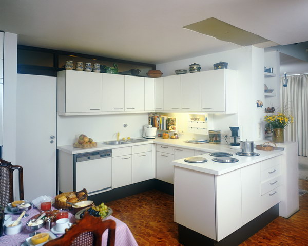 色彩心理學研究表明,藍色系是一種令人產(chǎn)生無限遐想的色彩,而橙紅的色彩讓廚房鮮艷明亮。藍色與橙紅的組合,在廚房里創(chuàng)造出一種前所未有的氣息及現(xiàn)代時尚氣息。紅色熱情奔放如火,白色的清潔與無瑕令人自由。紅白大膽搭配,既增加了房間的亮度,也使廚房充滿了幻想,很適合新婚夫婦。而白色與黑色強烈對比中卻可制造出一種沉穩(wěn)的效果。