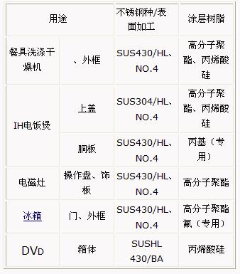 隨著不銹鋼用途的擴(kuò)大,在家電用途方面,指紋污染和食品、藥品等的腐蝕問(wèn)題已不容忽視,對(duì)此需實(shí)施樹(shù)脂涂層。但是,以往的著色涂層會(huì)損失不銹鋼特有的金屬光澤和觀賞性。因此,近幾年來(lái)在防止指紋污染和腐蝕的同時(shí),還開(kāi)發(fā)了觀賞性?xún)?yōu)良的透明涂層不銹鋼,使其在冰箱 、餐具清洗干燥機(jī)、IH電飯煲和電磁爐等家電的外裝飾方面被廣泛使用。