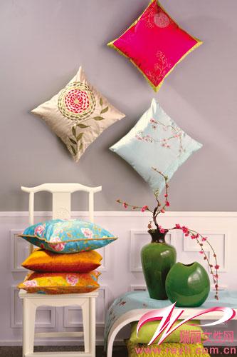團(tuán)花、梅蝶、翦梅、花鳥等中國元素圖案配以桃紅、鵝黃、淺金、湖藍(lán)等底色,運(yùn)用精美的玻璃紗銀絲貼繡工藝和特殊的燙鉆工藝,具有中國風(fēng)特色的抱枕是這一季主打,柔滑的紡絲材質(zhì)色澤清新艷麗,不易脫絲,便于保養(yǎng)。
