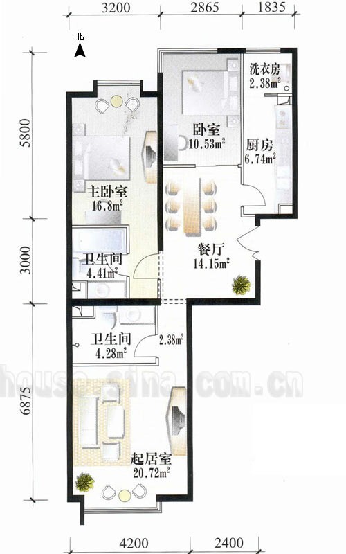 2、主臥配有衛(wèi)生間,廚房配有洗衣房,以人為本。