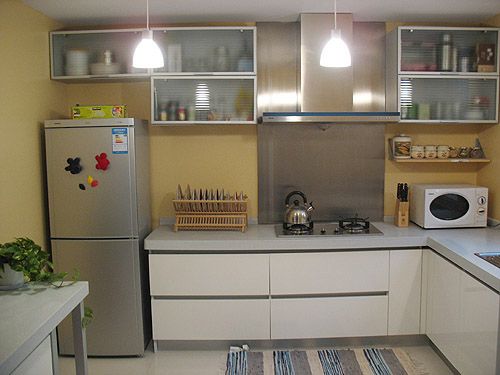 (2)L型:將清洗、配膳與烹調(diào)三大工作中心,依次配置于相互連接的L型墻壁空間。最好不要將L型的一面設(shè)計過長,以免降低工作效率,這種空間運用比較普遍、經(jīng)濟(jì)。