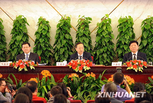 3月10日,十一屆全國人大二次會議舉行記者會,工業(yè)和信息化部部長李毅中、人力資源和社會保障部部長尹蔚民、商務部部長***答記者問。新華社記者陳樹根攝