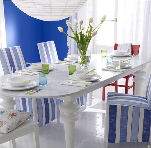 白色與藍色的搭配最能凸顯純凈感,在藍色墻面的映襯下,這張大理石面的白色餐桌充滿了地中海風情。