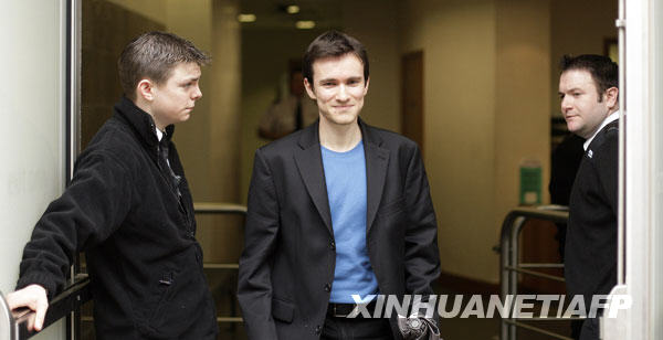 3月10日,曾干擾中國國務(wù)院總理***在英國劍橋大學(xué)演講的德國籍學(xué)生馬丁·延克(中)離開劍橋地方法院。新華社/法新