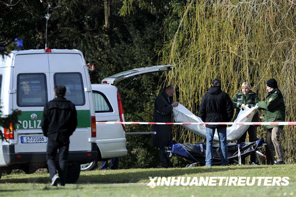 3月11日,在發(fā)生槍擊案的德國(guó)斯圖加特市附近小鎮(zhèn)溫嫩登一所名為艾伯特維爾的中學(xué)附近的公園,法醫(yī)將一具遇難者遺體抬離現(xiàn)場(chǎng)。新華社/路透