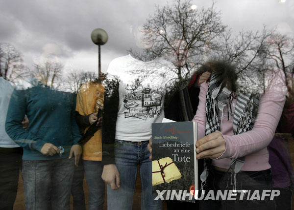 3月11日,在發(fā)生校園槍擊案的德國(guó)斯圖加特市附近小鎮(zhèn)溫嫩登一所名為艾伯特維爾的中學(xué),一名站在玻璃后的學(xué)生手中拿著一本名為《給一名亡者的情書》的書。新華社/法新