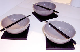 更值得一提的是這家店里的調料瓶的設計,完全顛覆了傳統(tǒng)瓶瓶罐罐給人的單調和油膩的感覺。有的是兩個等高的亞光錫制圓柱體小容器立在胡桃木的木制底托上,造型和顏色的搭配表現出明顯的西方設計的嚴謹和藝術性。兩個小容器的頂部鑿上幾個小孔,就是兩個精致的鹽罐和胡椒罐。還有的是兩外立蛋式的小圓容器,同樣的財質和色澤中間可以分開,也是放調味品的。還有的乍一看是橢圓柱體的白色瓷瓶,再一看,原來是兩個日月形狀疊加的,上端也有著同樣的小孔,也是兩個漂亮的調料瓶。也有的是兩個扁平蛋形的小白色瓷器,色澤盈潤,造型精致,有著東方設計的韻味,上面也有幾個小孔,也是調味瓶。這些小瓷器下面都有胡桃木的底墊,放置在桌上不失為精致的小飾品,而裝上了調味道料,就成了功能性極強的調味瓶,這樣的家飾品,哪個愛美的家庭主婦會不喜歡呢?