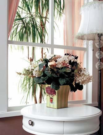布置窗的時(shí)候,不僅要注意色彩和諧,也要講究風(fēng)格的統(tǒng)一。梳妝臺(tái)上的手繪玫瑰圖案跟粉色條紋棉布窗簾在色彩上形成和諧呼應(yīng),手繪瓷盤典雅而不失活潑,為點(diǎn)睛之筆,烘托出一派英式鄉(xiāng)村風(fēng)格,與室內(nèi)整體格調(diào)完美統(tǒng)一。餐廳的窗下,最適合布置成這樣隨意溫馨的小景。