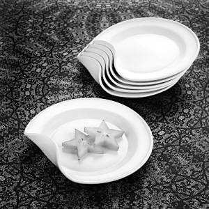盤子的造型是很奇特,但是真的是為了方便實(shí)用。彎曲的卷邊,讓人能吃到最后的美味:把食物歸攏堆積到盤子邊上,就可以方便地取用。而不必像平盤那樣,把盤子送到嘴邊才能解決問題。