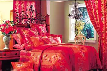 1.這款香艷的床品集合了春夏的多種色彩,具有東南亞民族特色的圖案為居室增加了幾分妖嬈的魅惑力。