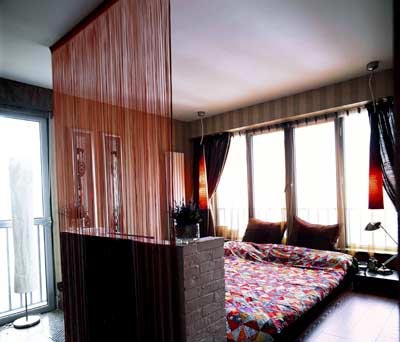 如何讓一個(gè)64平方米的空間充滿變數(shù)與可能,對(duì)于設(shè)計(jì)師而言應(yīng)該是最好玩的游戲了?,F(xiàn)在,一道矮墻隔斷了客廳兩邊,一邊是慵懶的藍(lán)調(diào)視聽空間,一邊是暢游沖浪的上網(wǎng)放松空間。而另一道矮墻出現(xiàn)在臥室,用小半段矮墻半包圍成電視墻,既滿足了在榻榻米上看電視的高度需要,又間隔出橙色簾幕一端的更衣區(qū)。