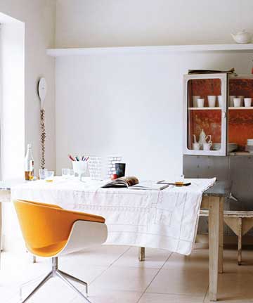 一把極具風(fēng)格的橙色椅子和橙色材質(zhì)的櫥柜使實(shí)用的廚房凸顯性格。精致的亞麻提花的舊桌布既遮蓋了有些磨損的桌面又給廚房帶來(lái)些許溫和雅致的氣質(zhì)。現(xiàn)在廚房在不做飯時(shí),也可以被用來(lái)看書或者思考了。