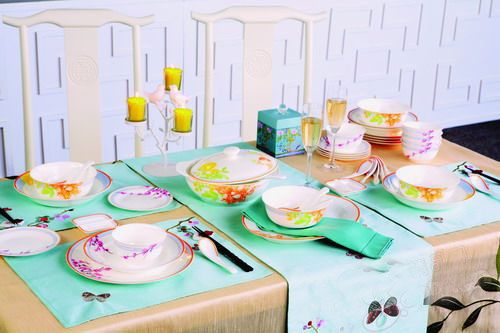 精美的玻璃紗銀絲貼繡工藝和特殊的燙鉆工藝,加之中國傳統(tǒng)的團花、翦梅、花鳥圖案,與具有濃郁中國風(fēng)的抱枕、桌巾、桌旗、桌墊等,構(gòu)成HOLA特力屋這一季的主推商品之一。經(jīng)由1250℃高溫素?zé)?,再以郎世寧工筆畫手法繪制花鳥圖案并經(jīng)1150℃釉燒而成的骨瓷餐具,更是將中國元素演繹到極致。