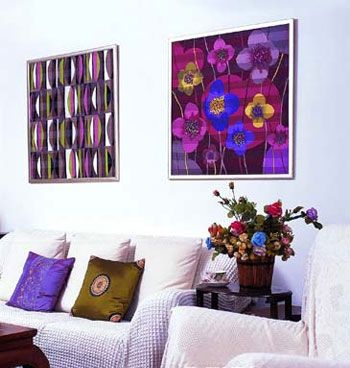 居室以白色為主題色,家具與沙發(fā)均為潔白,而墻壁上的絲巾掛畫則色彩紛呈。真絲色澤柔和,絢爛不囂張,與白色搭配完美。
