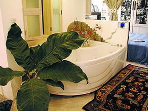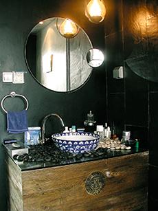 基調(diào)是一片蔚藍(lán),藍(lán)色的馬賽克、灰藍(lán)色的地磚。因?yàn)榭臻g相對(duì)較大,所以主人就有了很大的發(fā)揮余地,為洗衣機(jī)量身定做的小臺(tái),上面還可以放一些雜物,弧形的洗手池、手盆與同樣造型的整體浴房呼應(yīng)著,“整體浴房”其實(shí)是主人自己用磚砌出來然后貼上藍(lán)色馬賽克做成的。大面積使用馬賽克,并在頂部鋪上了溫暖的桑拿板,刻意做成的斜屋頂式燈箱是主要光源,設(shè)計(jì)的本意是希望給這個(gè)沒有一扇窗子的衛(wèi)生間,帶來一種有天窗的錯(cuò)覺。