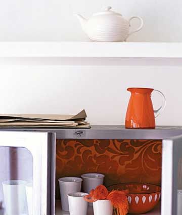 用鮮亮圖案的材質(zhì)或墻紙來(lái)重新裝飾櫥柜,這是一個(gè)簡(jiǎn)單易行的制造沖擊力的方法。用當(dāng)代風(fēng)格的墻紙、壁布,甚至是印刷品都可以,將它們貼在櫥柜里面、柜門上或者干脆就貼在外面。但最好和整個(gè)空間的風(fēng)格和色調(diào)相協(xié)調(diào)。