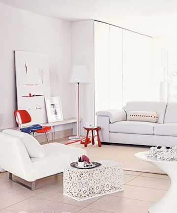 加入一些紅色元素使房間充滿現(xiàn)代感。一把經(jīng)典的餐桌椅,一個(gè)詭異的圓凳,一些細(xì)微而別致的鮮紅色裝飾;紅色的電話,話筒卻可以是白色,素色地毯的四邊只有一邊是紅色,白色裝飾畫,用剪開的方式呈現(xiàn)出內(nèi)部的紅色,紅色以不同的方式和形態(tài)出現(xiàn),引人注目卻又不喧賓奪主。