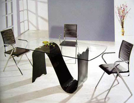 點綴:利用玻璃桌面反射的特點,改變周圍環(huán)境的色彩和紋理,就能間接地改變餐桌的個性。色澤柔和的餐布和餐具,立即使這款過于理性化的餐桌椅變得溫馨起來。