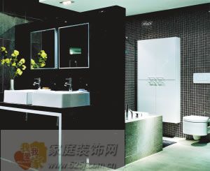 沉穩(wěn)雅致的風格在2007年絕對是最IN的潮流之一,黑色的馬賽克、復古型的瓷磚、簡潔的浴室家具,構成了仿佛黑白照片的整體效果。簡單、大氣、深沉是這個設計的最好詮釋,最簡單大方的干濕分區(qū)設計將洗手池和浴缸、淋浴及馬桶分開,使空間布局更加合理。特別是流行的雙面盆設計,讓兩個人都能有各自的專屬空間,在這個設計里,沒有過多的裝飾,一切以實用、美觀為主,代表了極簡主義風格的精髓。