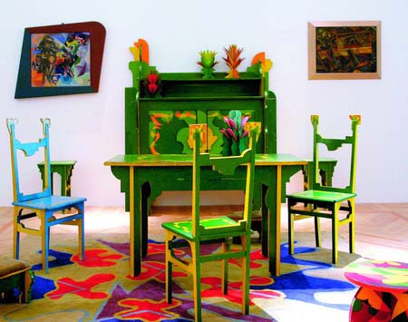 這套搭配運用的雖然都是古典元素,但效果極為現(xiàn)代,家具、地毯甚至連裝飾品都非常立體,墻上的兩幅油畫,都是立體派風格。整個房間的搭配非常和諧、有趣、獨特。