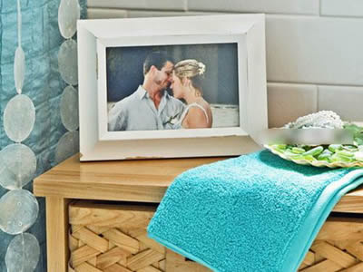 在浴室里放上自己的相框,讓這片大海也有了生命的氣息。海浪中的竹籃,可以用來儲存洗浴用品,籃子的顏色仿佛和沙灘的顏色一樣,也讓浴室在色彩上整體延續(xù)。一款精致的小碟,里面擺放著格各式的貝殼。
