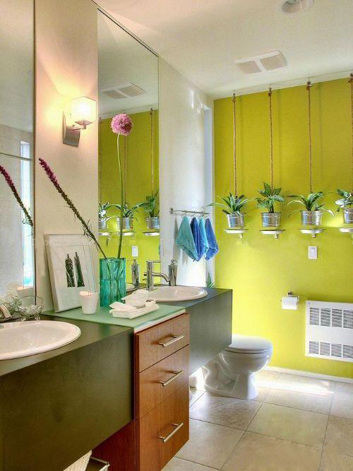 色彩的搭配:衛(wèi)生間的色調(diào)要柔和飽滿,一天的心情從洗漱開始,案例中黃綠搭配的效果,還有墻壁上的透明花盆裝飾的綠色植物,讓衛(wèi)生間也有生機。
