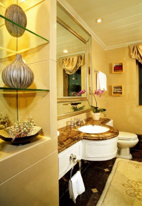 豪華衛(wèi)生間裝修:用金屬色點綴衛(wèi)生間,大理石臺面,玻璃裝飾架,處處顯示主人高品質(zhì)的生活最求。