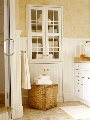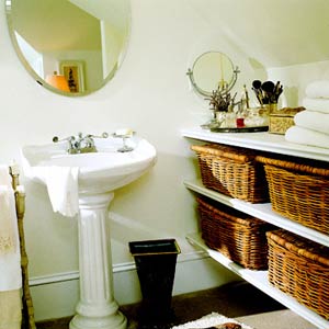 三層的置物架上整齊放置田園味十足的置物筐。置物筐可以方便的抽拉,用來分類存放毛巾及其他洗浴用品。