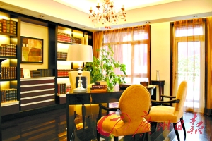 書房考究起來比較有學(xué)問。一般人書房內(nèi)有臺燈就夠了,因?yàn)榭磿恍枰酂簦侨绻挥信_燈的話,當(dāng)主人視力疲勞想轉(zhuǎn)移視線時就會出現(xiàn)問題,周圍沒有光線供眼睛休息,就容易出現(xiàn)眼花、頭暈的感覺,而這間書房燈飾的設(shè)計(jì)正好考慮到了這一點(diǎn),而且還可以將屋內(nèi)的照片和畫卷照明,讓人倍感溫馨。