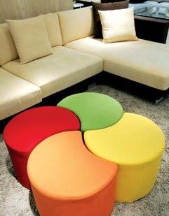 梅花墩,體積玲瓏,顏色靚麗,靈活多變,可以將小凳組合,形成梅花造型的休閑沙發(fā),又可以將它們變化角度旋轉(zhuǎn)拼湊,形成漂亮的風(fēng)車(chē)。如果將它們一字排開(kāi),就變成一個(gè)波浪形的沙發(fā)。