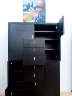 這款鞋柜高高大大,中規(guī)中矩,整體看上去像個(gè)憨厚笨重的大家伙,但你不可小瞧它的機(jī)關(guān)秘密。只要按動(dòng)那些白色的小按鈕,柜門(mén)就會(huì)一個(gè)個(gè)彈出來(lái),給你驚喜之外,還會(huì)讓你體驗(yàn)“挫折”,因?yàn)椴⒉皇撬械陌咨粹o都設(shè)有自動(dòng)彈開(kāi)的機(jī)關(guān),比如第二個(gè)和倒數(shù)第二個(gè)按鈕就完全是純裝飾用。所以你只有熟悉了它的小秘密,才能對(duì)它完全掌控。當(dāng)然鞋柜還是非常實(shí)用的。柜子中各個(gè)區(qū)域的面積大小不一,適合存放儲(chǔ)物,將中間抽屜彈開(kāi),那里才是放置鞋子的溫柔鄉(xiāng)。