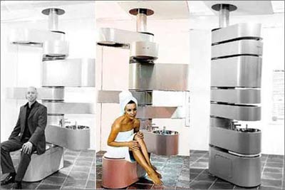 這個(gè)集成式衛(wèi)浴被形象地稱作為'脊椎',它將馬桶、水槽、浴缸和兩個(gè)淋浴器整合在一起,形成了一個(gè)8英尺(約2.4米)高的柱體。除了分別為大人和兒童準(zhǔn)備的兩個(gè)淋浴器只能旋轉(zhuǎn)180度以外,其余部分均可以旋轉(zhuǎn)360度。整個(gè)裝置的中軸是一根鐵柱,里面囊括了所有的管道系統(tǒng)。當(dāng)你需要使用哪個(gè)部分的時(shí)候,只需將它輕輕推出來(lái)即可,非常適合小戶型。