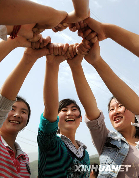 2009年5月11日,楊瑤(中)與同學在校園里做游戲。
