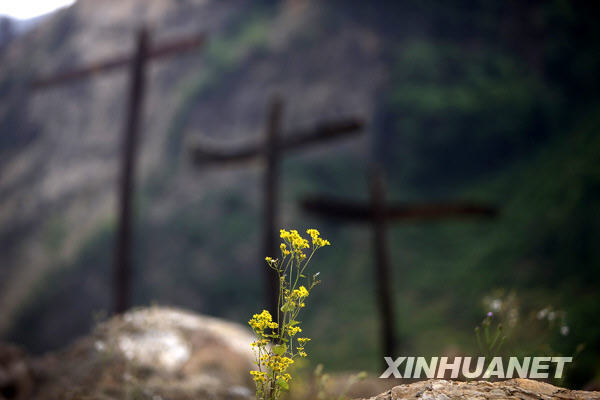 2009年5月11日,在青川縣東河口地震遺址公園,一朵小花頑強地從石頭中長出來。