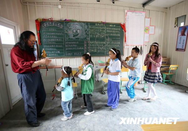 2009年5月1日,王曉春(左一)在指導孩子們進行隊列演奏。王曉春被映秀鎮(zhèn)村民稱為“超級志愿者”,他已年滿60,從2008年10月至今,他已為災區(qū)群眾連續(xù)工作了200多個日夜。他用音樂的美,為災區(qū)的孩子療傷,讓他們重拾信心,找回歡樂。