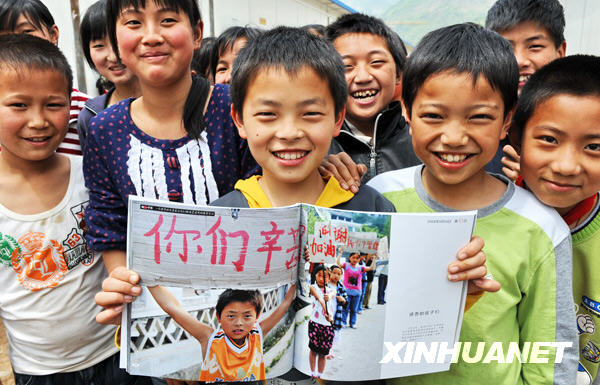 四川青川縣馬鹿小學的孩子們拿出印有他們照片的畫冊,請記者為他們留影(2009年4月21日攝)。2008年地震時,他們自發(fā)在公路旁打出自制感恩的標語牌,慰問援助隊伍,感動了無數(shù)人。