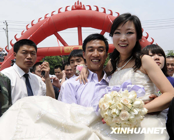 2009年5月12日,陳巖抱著新娘彭露穿過人群。當天,在地震中曾救出29人的志愿者陳巖在四川德陽市舉行了婚禮。