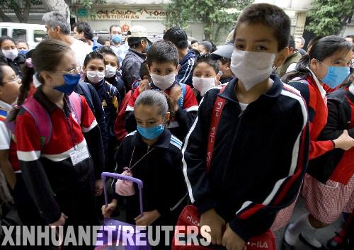 5月11日,在墨西哥首都墨西哥城,一些戴著口罩的小學(xué)生準(zhǔn)備進(jìn)入學(xué)校上課。當(dāng)日,因受到甲型H1N1流感疫情影響停課的墨西哥中小學(xué)和學(xué)齡前教育機(jī)構(gòu)開始復(fù)課。 新華社/路透