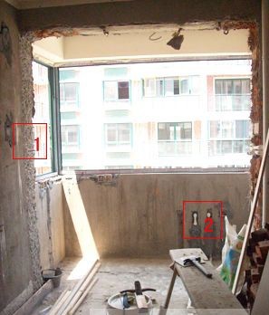 此工地還處于基礎(chǔ)的水電階段,從圖中能看到仍然裸露在外的管道線(2)。從圖中可以看出,陽臺被打通后擴大了廚房面積,使空間顯得不那么擁擠,圖上能清晰地看到被敲掉后的墻面痕跡(1)。