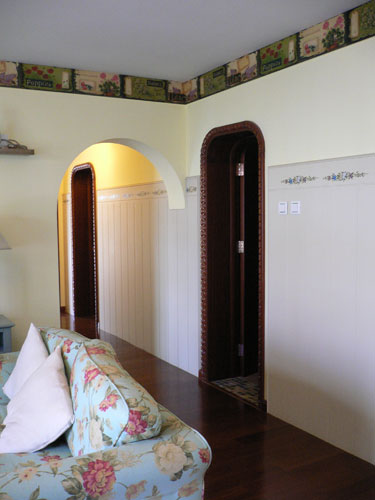 ②走廊護(hù)墻裙上貼的水移畫:其花朵圖案與頂上花朵形狀的吸頂燈交相呼應(yīng)表達(dá)了一種向往自然、田園的感覺。