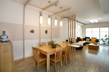 氣氛恬淡的客廳里,沙發(fā)、茶幾、墻壁、地毯的顏色組合出光感充足的明快基調(diào)。一盞吸引眼球的吊燈,有趣的圖案讓整個(gè)空間變得活潑起來(lái)。明亮、熱烈、豐富的色彩營(yíng)造出清新的客廳氣氛。