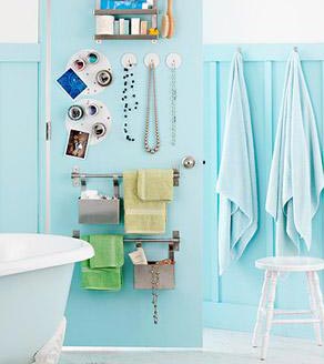 毛巾、手紙、電吹風(fēng)……統(tǒng)統(tǒng)請(qǐng)上墻去。幾塊簡(jiǎn)單的玻璃板懸于壁上,用來(lái)擺放化妝品。
