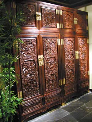 由印度檀香紫檀木制成的箱柜是“晶森堂”推出的精品之作,由頂箱和立柜兩部分組成,雙門對開。柜門及面板上展現(xiàn)浮雕十八羅漢,充滿了濃郁的歷史文化氣息。