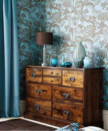 在這里,古樸與張揚和諧共存,泛黃的銅環(huán)抽屜與藍底黑紋墻紙并不突兀。新與舊的家具、墻紙、飾物互相映襯,相得益彰。