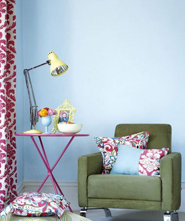 淺藍色墻壁,白底粉花大幅窗簾,灰白色地毯,青灰色小沙發(fā)上,是兩個五彩斑斕的靠墊,地毯上配以兩個大號大花紋墊子。粉紅色的三腳支架小桌上,擺有明黃色底座和燈罩的臺燈,畫框、碗以及白色花瓶和數(shù)朵鮮花。顏色混搭充斥著房間的每個角落,絢麗的色彩讓人目不暇接,恍若置身童話的世界。 淺藍色墻壁,白底粉花大幅窗簾,灰白色地毯,青灰色小沙發(fā)上,是兩個五彩斑斕的靠墊,地毯上配以兩個大號大花紋墊子。粉紅色的三腳支架小桌上,擺有明黃色底座和燈罩的臺燈,畫框、碗以及白色花瓶和數(shù)朵鮮花。顏色混搭充斥著房間的每個角落,絢麗的色彩讓人目不暇接,恍若置身童話的世界。