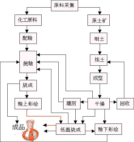 黏土采類(依礦脈大小、顏色品質(zhì)好壞、可塑性及穩(wěn)定性高的粘土,方能成就好的作品)處理純凈(以水簸法,去砂石)練土(為求黏土中水份軟硬一致,消除氣泡,可用獸力、人練、機(jī)器練土)成型加工(手捏、泥條、陶板、拉坯、注漿、鏇坯、擠出、重壓...各成型法作陶)裝飾(以雕塑法,或多色土之變化,可用刮、切、壓、印、黏貼、鑲嵌、鏤空)乾燥(室溫自然陰乾或烘乾35~200℃)裝飾(陰陽刻劃,或化妝土)素?zé)s700~850℃或1000~1250℃)(去除坯土中之結(jié)晶水、有機(jī)物、空氣,且可增加坯體強(qiáng)度)上釉(可淋、噴、彩繪、灌、浸...等方法上釉,上釉前先噴少許水份於素坯上,不可施太厚,以防縮釉、裂釉)釉燒(土器950~1100℃、缸器1100~1200℃、硬質(zhì)陶器1180~1280℃、輕質(zhì)瓷960~1050℃、瓷器1300~1400℃、高鋁器1400~1850℃、窯具以電窯、瓦斯窯、柴窯,重油窯)成品——二次燒成法(有釉下彩或單色釉、多重釉彩、結(jié)晶釉)