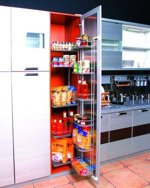 如果你家櫥柜的里面是干干凈凈的擱板配門板,那你在儲(chǔ)物的空間利用上就大大落伍了,現(xiàn)在的櫥柜要的就是打開之后像冰箱一樣井然有序。