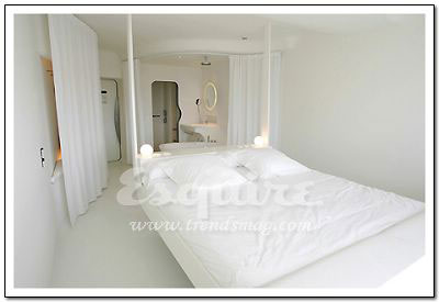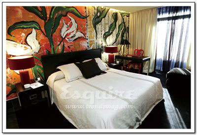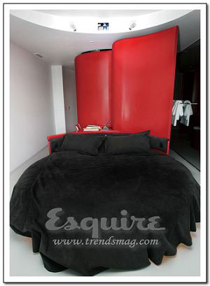 深處其中最大的感覺:流動(dòng)。Zaha.Hadid在這套房間中以數(shù)字設(shè)計(jì)的新發(fā)展為基礎(chǔ),用流暢但不規(guī)則的墻壁線條,體現(xiàn)了空間流動(dòng)性的特色,好像一個(gè)漂亮的模具。最不起眼的關(guān)鍵所在:電視機(jī)下的白色遙控器。它控制著屋內(nèi)所有內(nèi)嵌在墻壁內(nèi)的尖端數(shù)字設(shè)備,從激光燈到數(shù)字電視。最值得學(xué)習(xí)的搭配:橘黃色鑲黑的現(xiàn)代主義印花床單。
